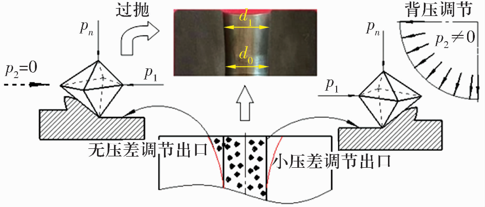 在上述無(wú)背壓的“穿膛過(guò)”磨粒流加工條件下,將加工后的工件線切割開,可以明顯看出進(jìn)出口處的尺寸d1,大于中間區(qū)域的尺寸d0,并形成“喇叭口”。出現(xiàn)該結(jié)果的主要原因是由于黏彈性磨料在出口處的突然擠入與釋放時(shí)形成的擠壓壓力過(guò)大,從而在工件兩端出現(xiàn)嚴(yán)重的過(guò)拋現(xiàn)象,嚴(yán)重影響空心滾子的尺寸。為避免“喇叭口”的形成,應(yīng)該控制進(jìn)出口的壓差,使磨粒流在加工過(guò)程中實(shí)現(xiàn)均勻的擠壓運(yùn)動(dòng)。因此,在擠壓過(guò)程中對(duì)磨粒流施加一個(gè)回程壓力,即背壓P2與“穿膛過(guò)”式(背壓P2為零)的情況相比,在擠壓過(guò)程中增加磨料流回程壓力,可以降低壓力在進(jìn)出口處的突變,實(shí)現(xiàn)進(jìn)出口處壓力的小壓差調(diào)節(jié),從而有效抑制“喇叭口”的形成,其原理如圖6所示。