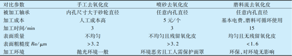 基于上述試驗(yàn)結(jié)果,將磨料流去氧化皮方法與傳統(tǒng)手工和噴砂去氧化皮進(jìn)行對(duì)比,結(jié)果見表1,采用磨料流加工方法去除氧化皮的經(jīng)濟(jì)性和加工質(zhì)量均明顯優(yōu)于其他2種,且磨料流加工法更環(huán)保,但加工效率略低于其他2種。
