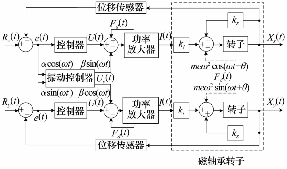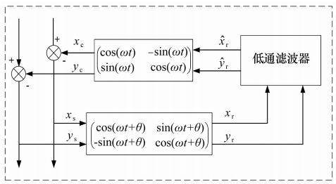 2015年,文獻[18]將電動機傳動控制中同步旋轉(zhuǎn)坐標系(Synchronous Rotating Frame,SRF)變換的方法應(yīng)用于磁軸承系統(tǒng),其控制原理如圖7所示,相當于一種新型的陷波濾波器,通過與控制器串聯(lián)工作在轉(zhuǎn)子低速旋轉(zhuǎn)時有良好的同步抑振性能。