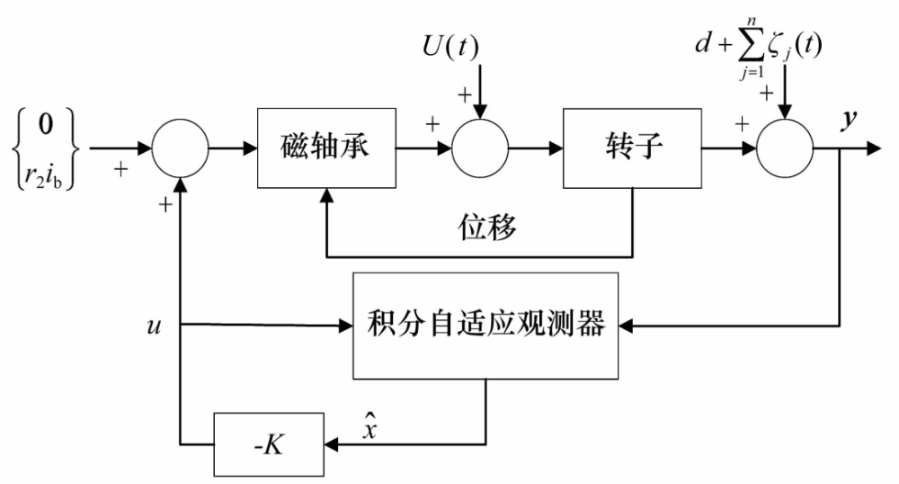 另外,文獻[26]提出了一種基于頻域自適應(yīng)LMS算法的諧波振動抑制方法,對每個權(quán)值設(shè)置相應(yīng)的步長并實時調(diào)整,在保證穩(wěn)態(tài)精度的同時提高了收斂速度。文獻[27]提出了一種新的積分自適應(yīng)觀測器(圖9),用于識別傳感器誤差的直流和諧波含量并同時估計系統(tǒng)狀態(tài),試驗表明當系統(tǒng)同時受到測量誤差和不平衡干擾時能有效減小位移和電流幅值。文獻[28]提出了一種針對低次主導(dǎo)諧波的通用選擇分數(shù)階重復(fù)控制方法,實現(xiàn)了任意轉(zhuǎn)速下快速高精度的諧波電流抑制。