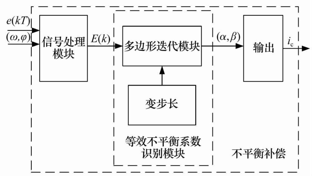 文獻[36]提出了一種可變步長( Variable Step Size,VSS)的迭代算法,其是對定步長( Constant Step Size,CSS)迭代算法的延伸優(yōu)化,控制方法如圖12所示,通過信號處理模塊、迭代模塊和輸出模塊不斷的迭代計算以找到不平衡力幅值的準確解。2種算法的對比結(jié)果表明,VSS算法具有更好的準確度和收斂速度,當轉(zhuǎn)速升高且超過臨界值時CSS算法失去了補償效果,而VSS算法仍可進行補償,能夠更好地抑制轉(zhuǎn)子跨階時的不平衡振動。