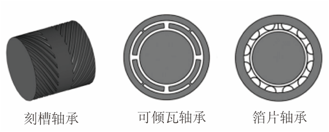 兩相對運動表面形成一定收斂間隙,運動表面的高速移動將具有黏滯性的氣體帶入楔形間隙產(chǎn)生壓力升,進而產(chǎn)生作用于轉(zhuǎn)子的承載力,承載力的大小隨轉(zhuǎn)速的增加而增加。楔形間隙、潤滑氣膜厚度及氣體的黏滯性是形成動壓效應(yīng)的關(guān)鍵條件。由于擺脫了對氣源供氣系統(tǒng)的依賴,使得氣體動壓軸承結(jié)構(gòu)簡單、成本降低。但是,在啟停階段轉(zhuǎn)速較低、動壓效應(yīng)較弱時,不足以產(chǎn)生作用于轉(zhuǎn)子的支撐力,導(dǎo)致轉(zhuǎn)子與軸承內(nèi)壁接觸,產(chǎn)生嚴(yán)重的摩擦磨損,直接影響軸承的壽命。此外,氣體動壓軸承還存在阻尼特性差,轉(zhuǎn)子過臨界難的問題。針對以上問題,研究者通過開發(fā)耐磨涂層或設(shè)計不同結(jié)構(gòu)形式的軸承來解決此問題。其中比較有代表性的氣體動壓軸承結(jié)構(gòu)形式有刻槽氣體動壓軸承、可傾瓦氣體動壓軸承、箔片氣體動壓軸承,如圖4所示。