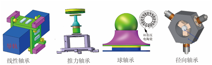 當(dāng)前,對于擠壓膜氣體軸承的研究主要集中在潤滑機理分析和軸承結(jié)構(gòu)改進上。對于潤滑機理的研究主要從兩種理論進行分析,分別是聲輻射理論和流體潤滑理論。由于流體潤滑理論便于分析轉(zhuǎn)速對擠壓膜氣體軸承特性的影響,因此,被大多數(shù)研究者采用。對于擠壓膜氣體軸承結(jié)構(gòu)的改進上,研究者分別提出了擠壓膜氣體線性軸承、擠壓膜氣體推力軸承、擠壓膜氣體球軸承、擠壓膜氣體徑向軸承,如圖6所示。